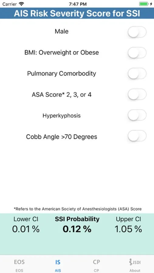 Push on the switches next to each risk factor and the SSI probability will be shown at the bottom of the page. To reset, shake the device. A Reset Dialog will appear to reset the calculator.