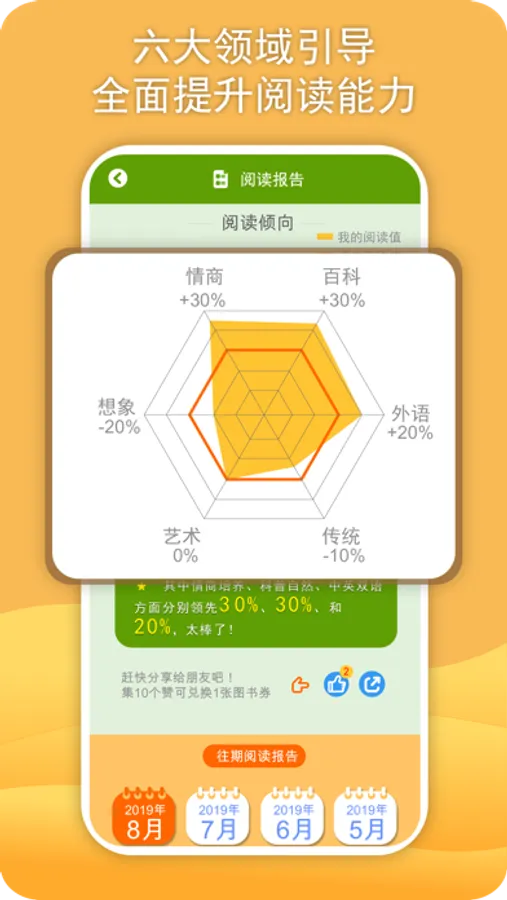 1.直观的《阅读报告》从6大领域引导学生均衡阅读,陆续上架68类兴趣方向的中外优秀作品,是有声图书的王国。