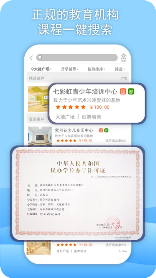 1.入驻的是正规资质的教育机构以及体验场馆,用户在本平台上购买课程,可享受7天退款等保障,还支持课程转让。