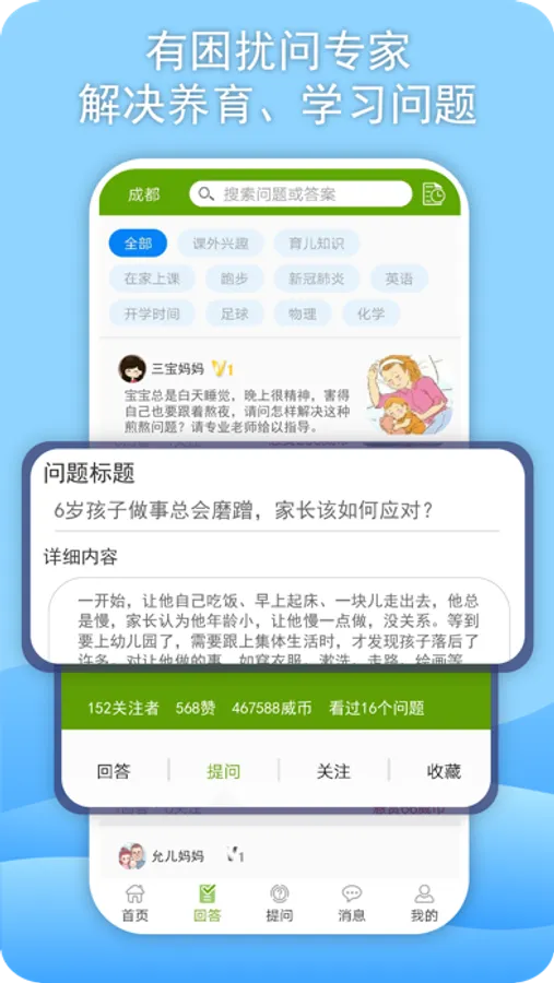 “学问”栏目是家长与老师、专家互动交流的问答平台。困扰家长的养育、成长、学习、性格等问题,都可以找到专业的建议和实用的方法。