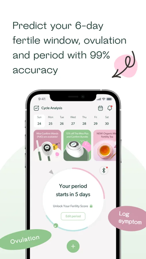 Mira predicts your ovulation and pinpoints your 6-day fertile window by learning about your unique cycle over time. All with 99% lab-grade accuracy.