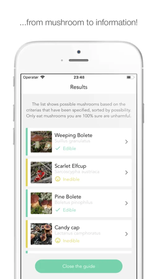 The information in this application is constructed in the best possible manner and everything has been made to ensure that the information displayed is correct. However, this does not guarantee that errors can occur. The people behind this application do not take any responsibility for potential pains, intoxications or any other possible issues that could arise from using the information in this application. People respond differently to different mushrooms and allergies can occur. Always use common sense by only eating mushrooms you are completely sure are not harmful to you.