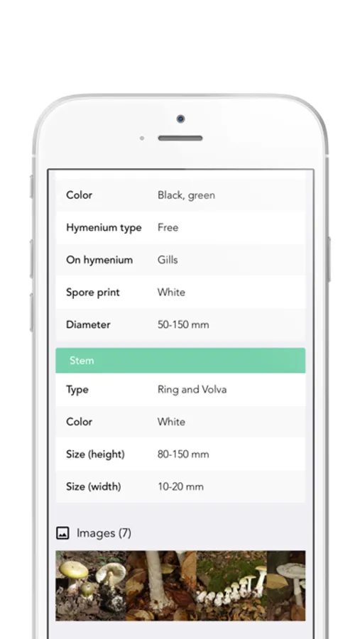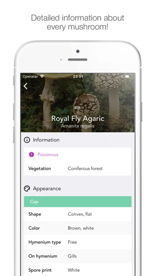 First and foremost, the important edibility information. This is clearly color-coded and categorized by the following scale: Delicious, edible, allergenic, inedible, poisonous and deadly. Secondly, Mushy does not only contain information about the vegetation of every mushroom but more detailed information such as WHERE in a forest that specific mushroom is more likely to be. This can for example be things like "moss", "under pine trees" and "on stumps". Furthermore, every independent part of the mushroom is listed separately where each has detailed information about its characteristics. For example, the information about the cap contains specific traits like spore print, diameter and many more.