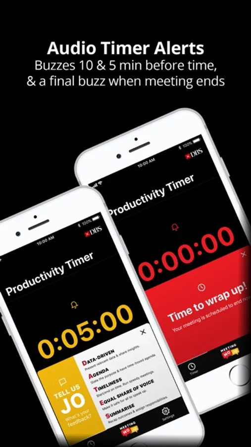 Audio-Timer Alerts To End On Time: Buzzes 10 & 5 minutes before time. Final buzz when meeting ends.)