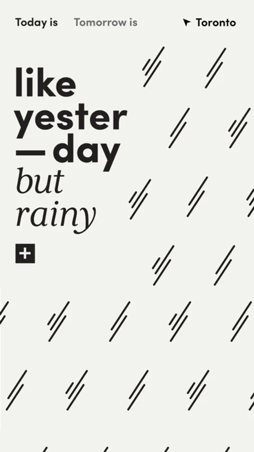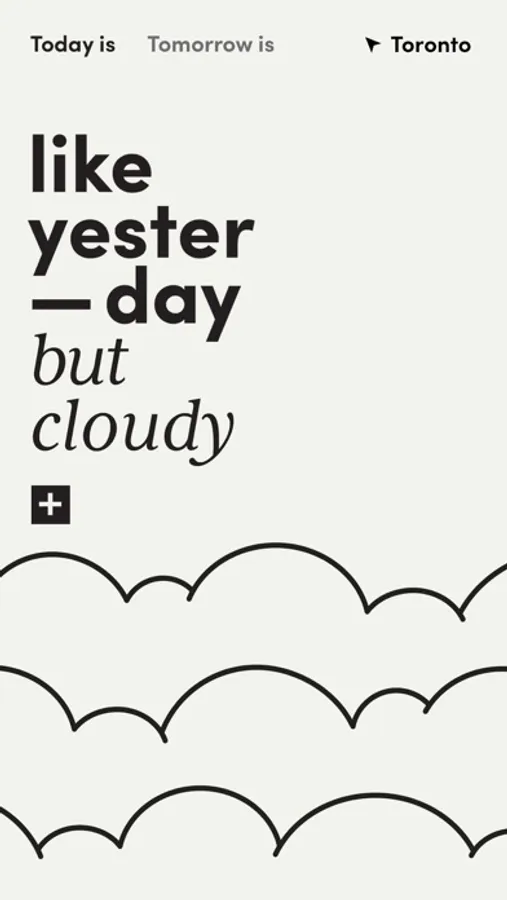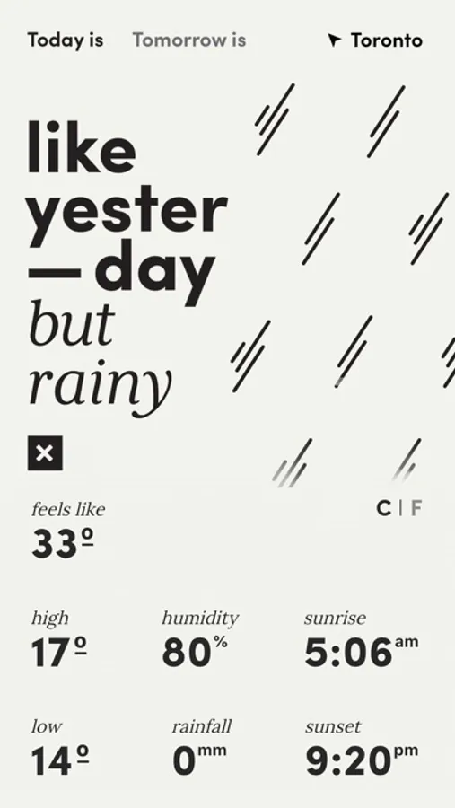 This app has literally no settings and I love it. It just looks at your location and tells you the weather relative to the previous/next day in simple language. The interface is sleek and all of the elements are thoughtfully laid out. Really good design overall and I love how the dev committed to a fairly simple app and made it great rather than adding a bunch of settings to try and accommodate everyone.
