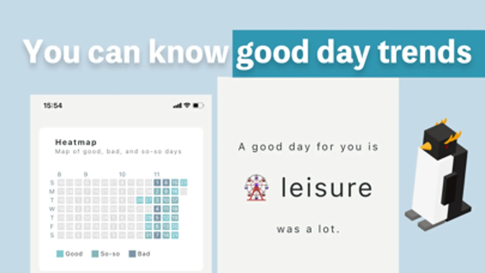 You can discover what words are associated with a good day or a bad day by writing the reasons in your diary. The criteria for judging a good day and a bad day change. The feature of this app is that you can notice the changes in the criteria.