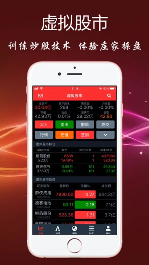 游侠虚拟股市是中国股市的“山寨”版,提供高度拟真的虚拟股票交易体验,无论是准备入市或者即将入市的新股民,还是已有实盘炒股经验的老股民,游侠虚拟股市都是您学习炒股知识,训练炒股技术,积累炒股经验,体验庄家操盘的高效工具。在虚拟股市,会员可以体验散户、中大户、游资、庄家、基金经理等不同角色、不同操作方法和风格,通过不同的视角深入了解、体验股市的运行机制和盈利途径,可以更快更深入的了解股市,学习股市,锻炼和提高交易技巧,从而为实盘交易打下坚实基础。