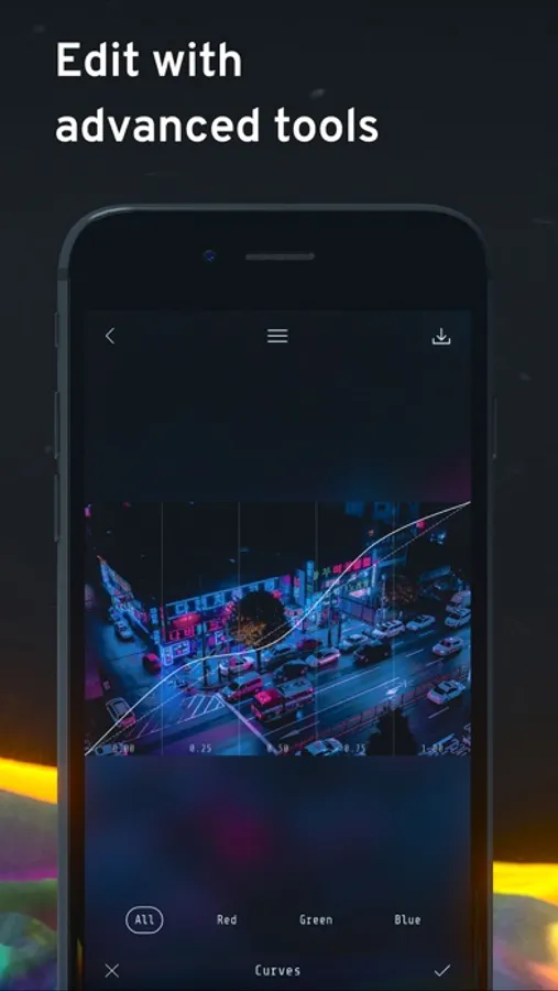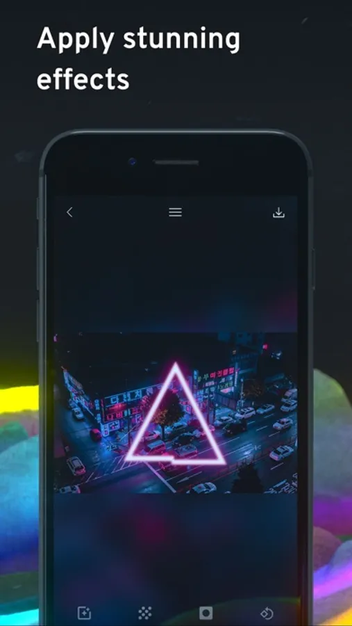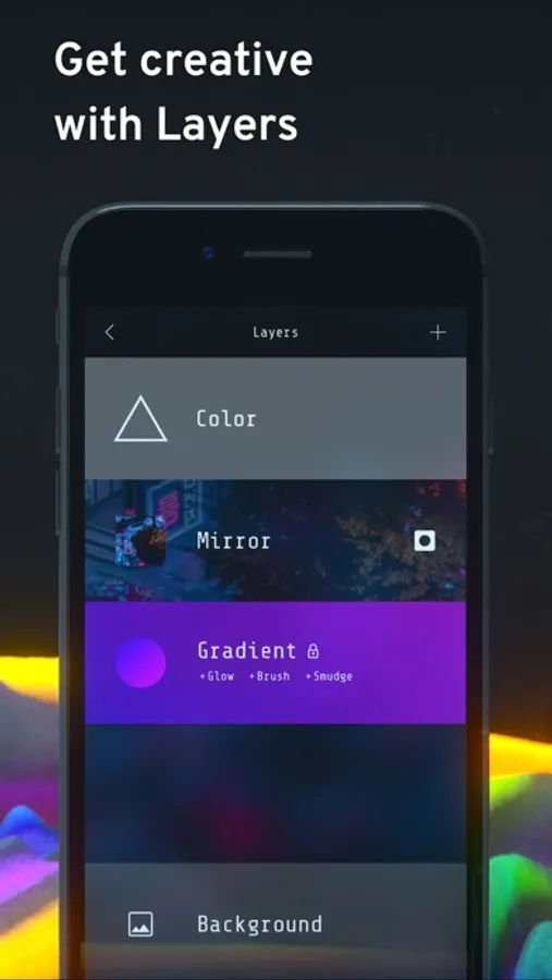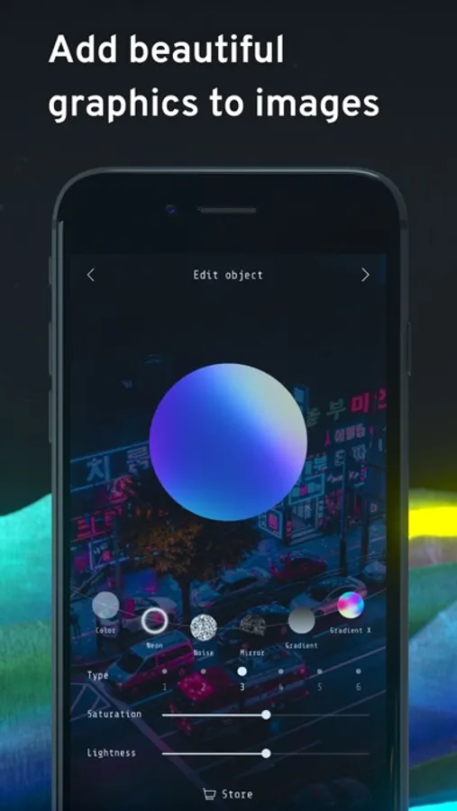 • Try all of the six types of carefully curated artistic effects: Color, Neon, Noise, Mirror, Gradient, Gradient X.