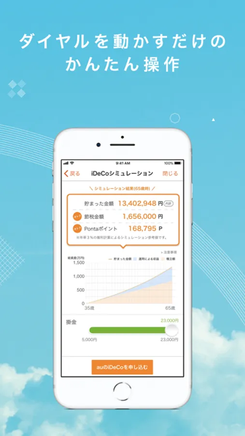 「auのiDeCo(イデコ)アプリ」では申し込みをする前に、職業、年収、年齢を選択し、月々の積立額を決めるだけで、60歳になるまでにiDeCoでいくら積み立てられるか、いくら節税できるかがひと目でわかるシミュレーションができるので、目標に向けた月々の積立額、運用スタイルの計画を立てる際の目安になります。