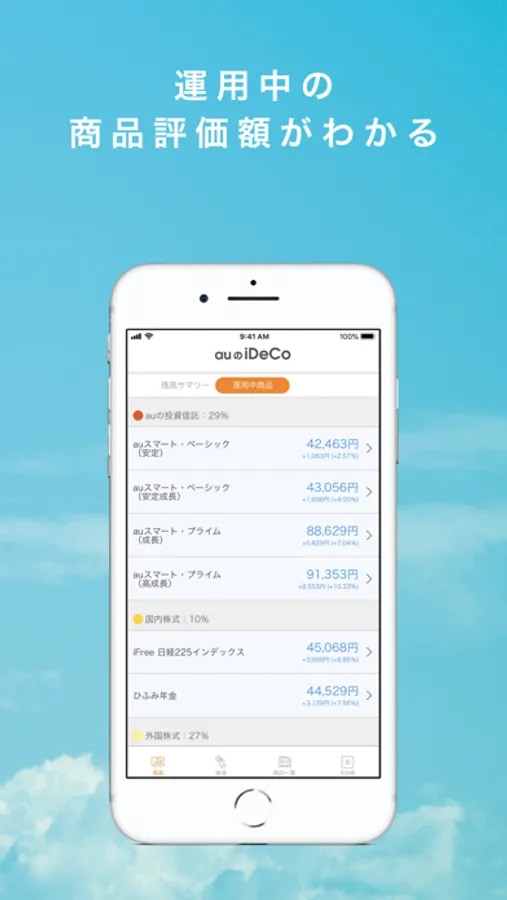「auのiDeCo(イデコ)」は、申し込みもスマホでカンタン!申し込みをしてから加入までのステータスもアプリで管理できます。加入後は運用状況(運用中の商品の評価金額)もアプリからかんたんに確認でき、運用スタイルの見直しもアプリでできます。
