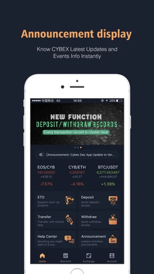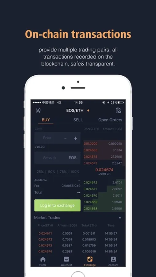 Cybex is the best decentralized exchange enabling the transaction of trading pairs among BTC, ETH, LTC, CYB, etc. via mobile end clients. Meanwhile, as a decentralized one, all transactions must be recorded on the blockchain, enhancing the safety and significantly protecting the ownership of users’ assets from being taken by any exchange. As the official App of Cybex, the software is committed to providing safe, transparent and swift mobile-end trading experience.