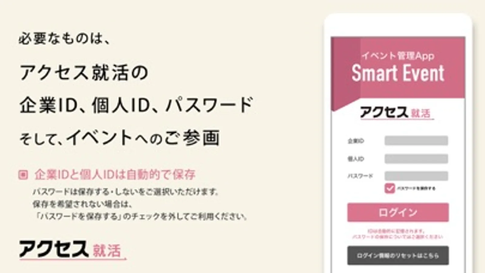 アクセス就活 イベント管理アプリをご利用いただくためには、「アクセス就活 企業管理」でご利用の下記情報が必要となります。