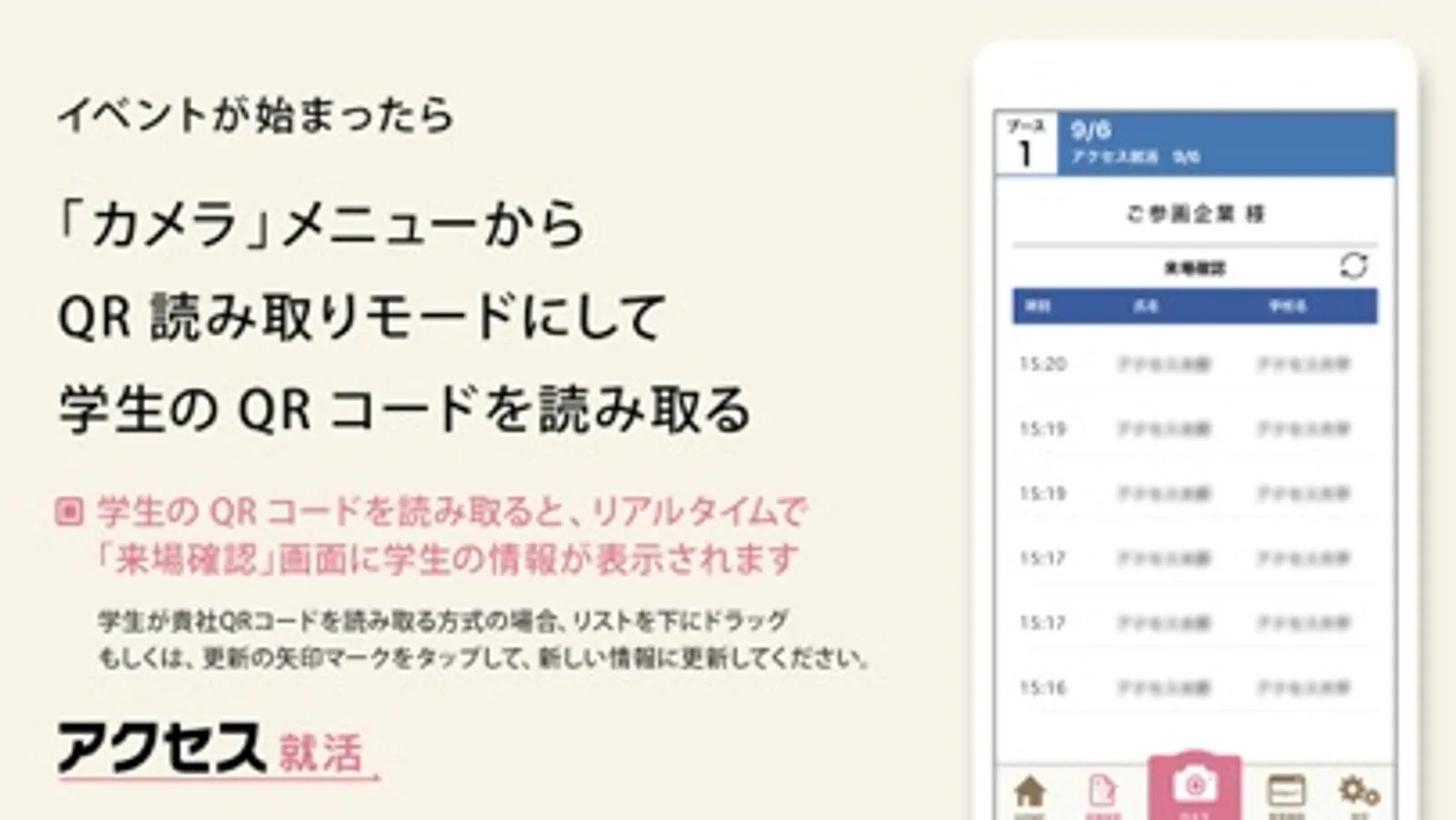 アクセス就活イベントで貴社ブースに学生が訪問した際に、学生が提示するQRコードを読み取って訪問履歴を蓄積・管理するアプリです。