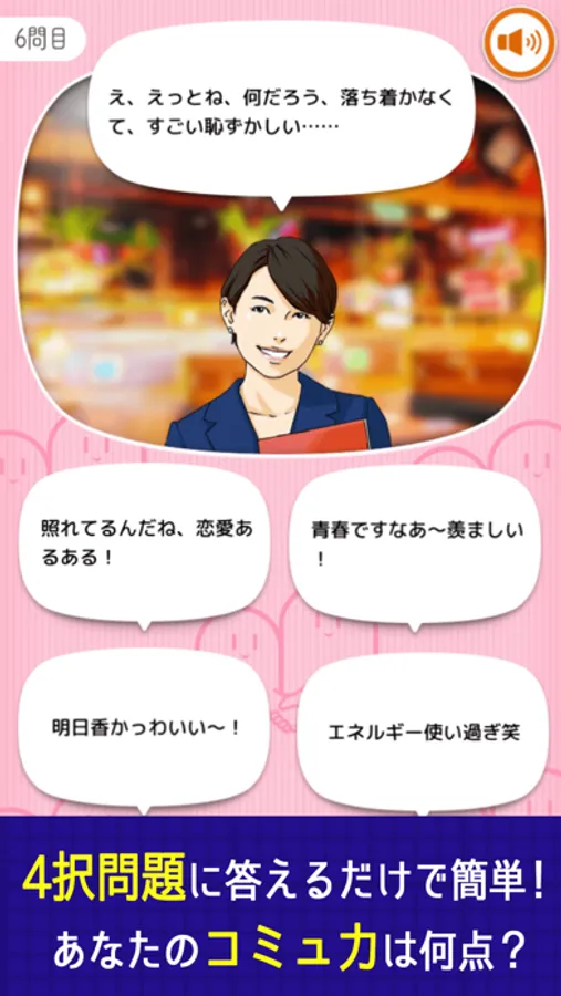 相手の問いかけに対して最適な返答を選ぶだけの簡単操作で、あなたのコミュ力が診断できます!