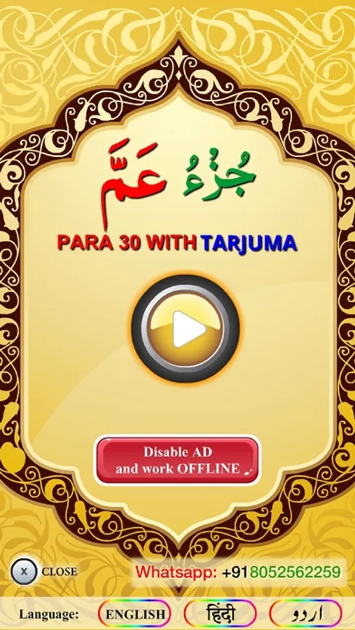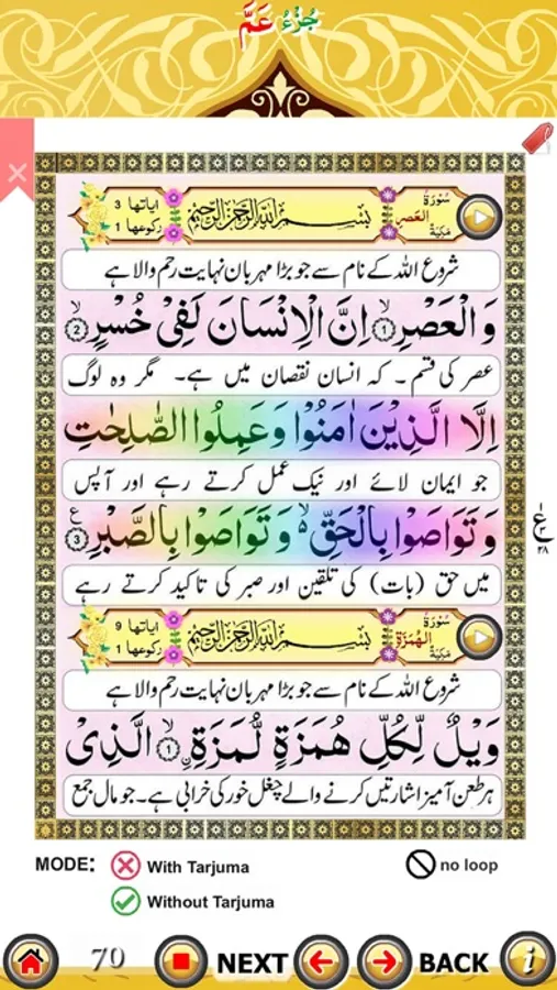 The Holy Quran is divided into 30 chapters also known as thirty PARA's. In this app 30 PARA which is also known as AMMA PARA is presented with Tarjuma.