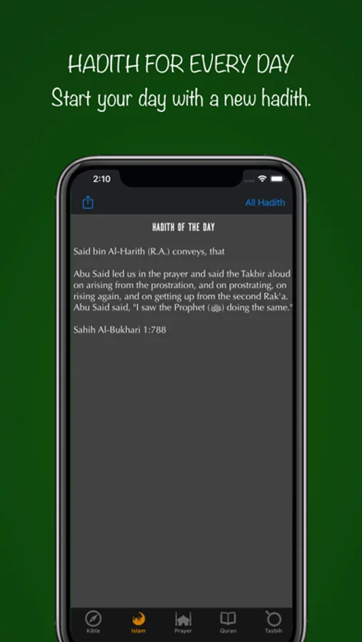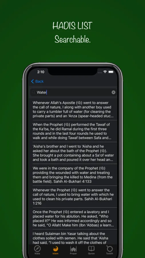 - The "Hadith of the day" tab is updated every day. Also available is a list of the most popular hadiths with keyword searches.