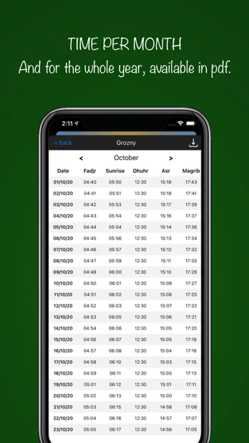 - The namaz schedule is available immediately for a year, it is displayed monthly at a time and the ability to export a table in pdf format has been added.
