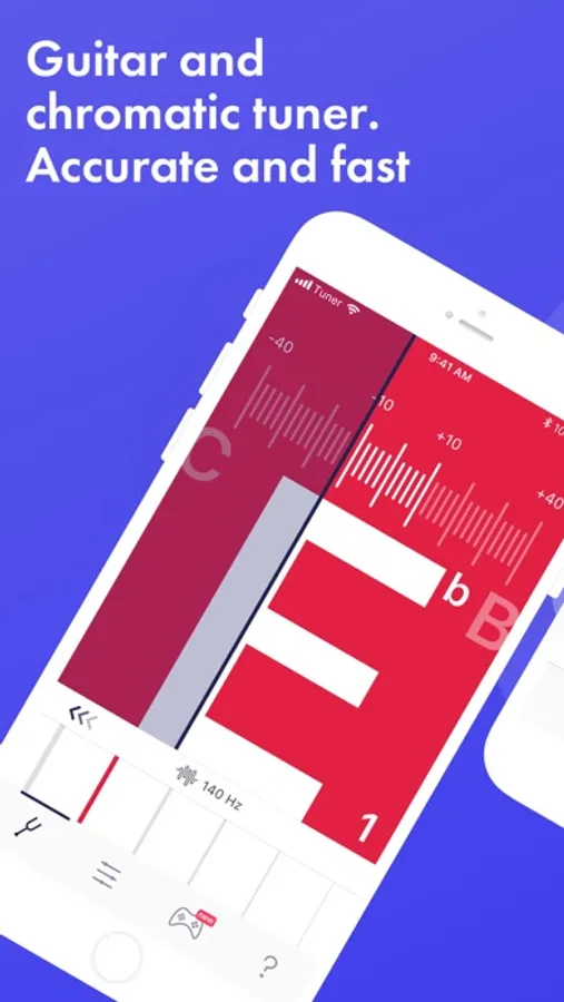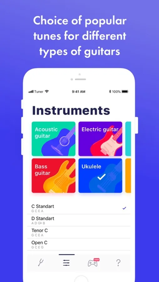 Unlike many other tuners Tuner ONE allows you to tune the electric guitar, acoustic guitar, bass guitar and ukulele smoothly, quickly and with the least fluctuations. The tuner can be used as a chromatic tuner (you can even tune a piano) and a tuning fork.