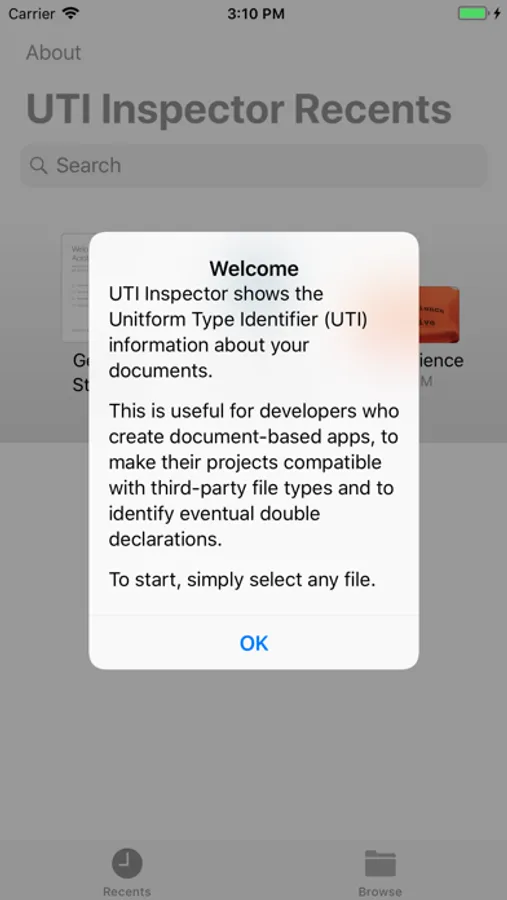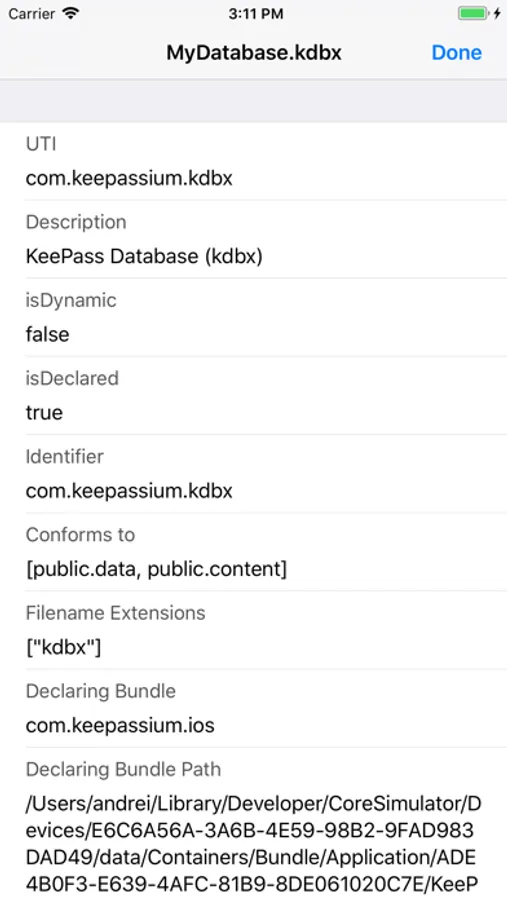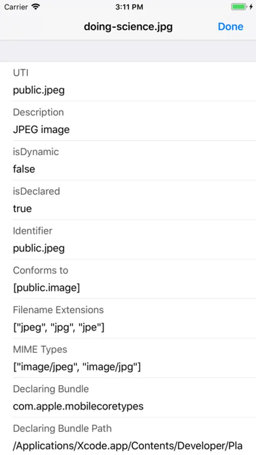 UTI Inspector shows the Unitform Type Identifier (UTI) information about any document on your device: which UTIs are registered for a given file extension, which apps declared them and how they did it.