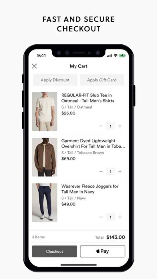 • High quality photos of tall clothing, with a pinch to zoom feature for detailed exploration of fabrics and features.