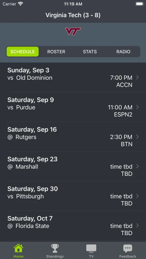 "...love the TV schedule. No longer have to look at my cable guide to look at my game schedule during College Game-day."