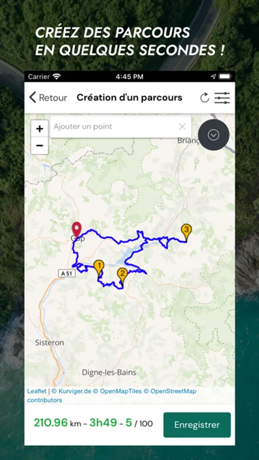 Prochainement, nous vous proposerons d'enregistrer vos parcours et de les aggrémentés directement depuis l'application. En attendant, vous pouvez le faire sur notre site internet.