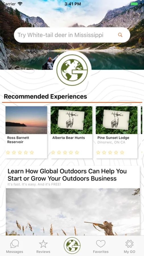 Global Outdoors is an app for people who love the great outdoors. The Global Outdoors app allows you to find, rate, and review outdoor experiences. It is for hunters looking for that big buck, fishermen wanting to reel in that giant bass, hikers looking for the next incredible challenge, and all points and places in between. Soon, the app will allow users to book, through the app, outdoor experiences. Go hunting, go fishing, go exploring, just GO.