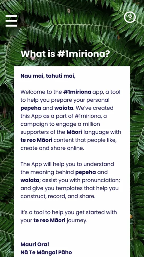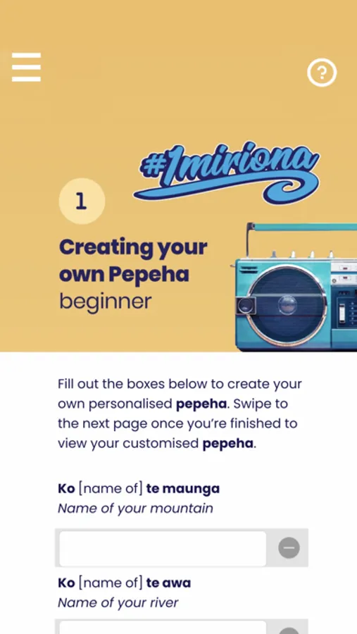 Nau mai, tahuti ma! Welcome to our #1miriona App, an interactive app that helps you create your personalised pepeha and waiata.