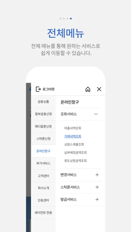 - 할부금융신청, 메디칼론신청, 스탁론신청 등 대출업무기능을 제공합니다.