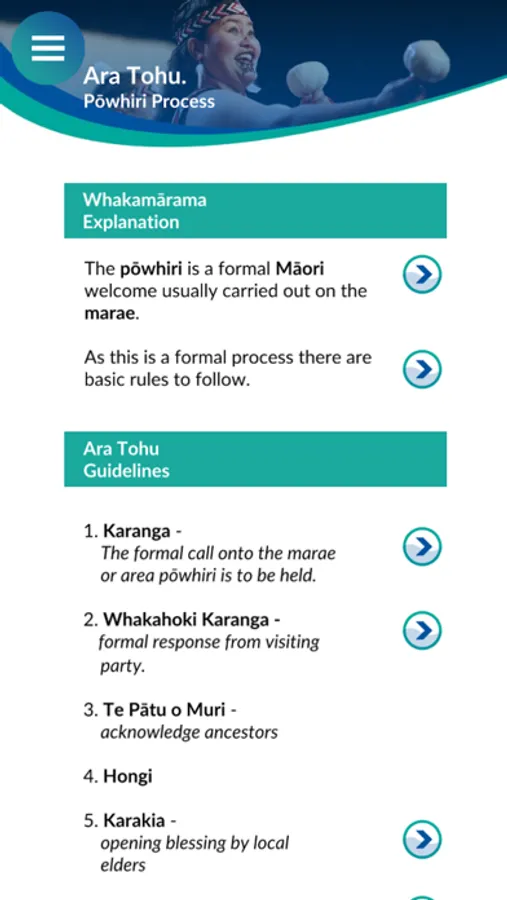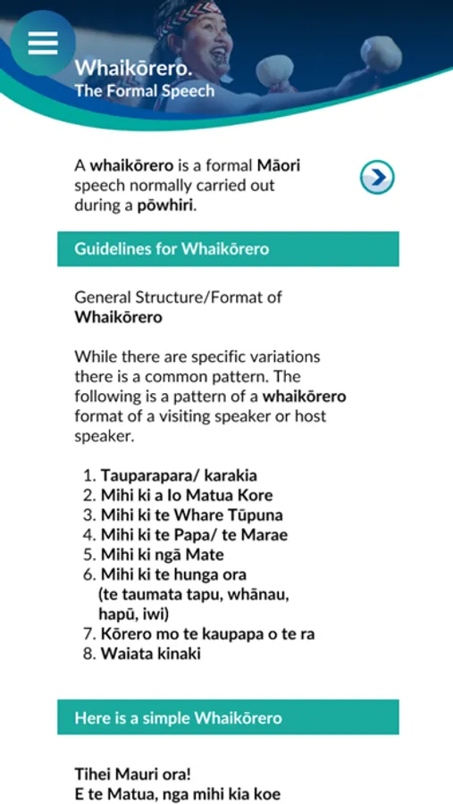 Interactive features within the app include pronunciation of Māori words, maps with Māori names and iwi groups, values (Ngā Mātāpono), and principles, mihimihi/pepeha (introductions), ngā mihi (greetings), poroporoaki (farewells), whakataukī (proverbs), and waiata (songs).