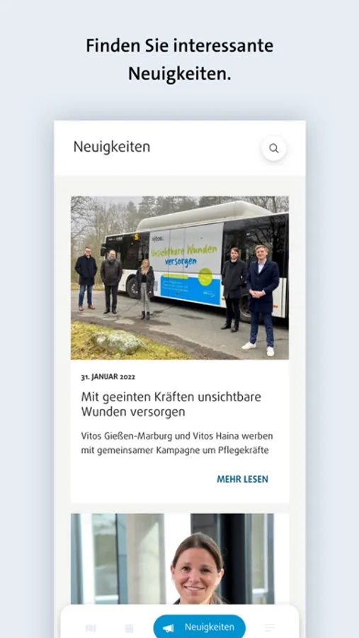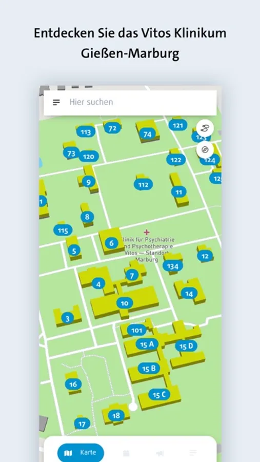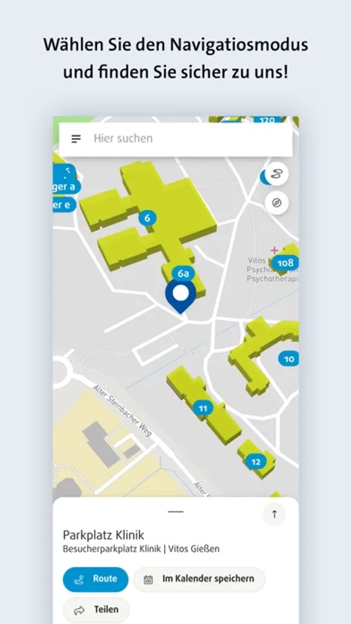 Mit dem neuen Vitos Navi können Sie sich auf unserem Gelände navigieren lassen. Sind Sie mit dem Auto unterwegs, werden Sie nach Wunsch zuerst zum nächstgelegenen Parkplatz geleitet, bevor es zu Fuß weitergeht. Wir berücksichtigen auch Routen für Bewegungseingeschränkte, sodass Sie immer sicher an Ihr Ziel finden.