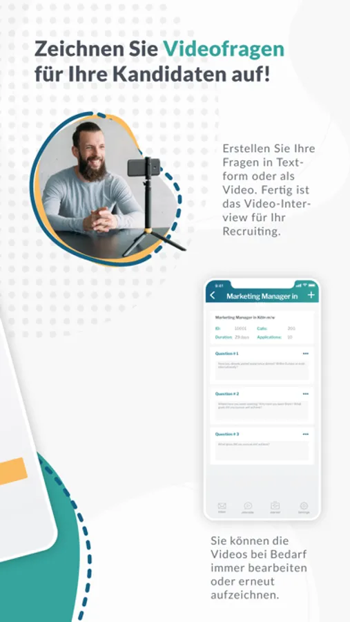 Erstellen Sie Ihren Opener, wählen Sie einen passenden Musiktitel und beantworten Sie die vier Leitfragen oder setzten Sie eigene Schwerpunkte. In 10 Minuten haben Sie Ihre eigene videobasierte Stellenanzeige fertiggestellt.