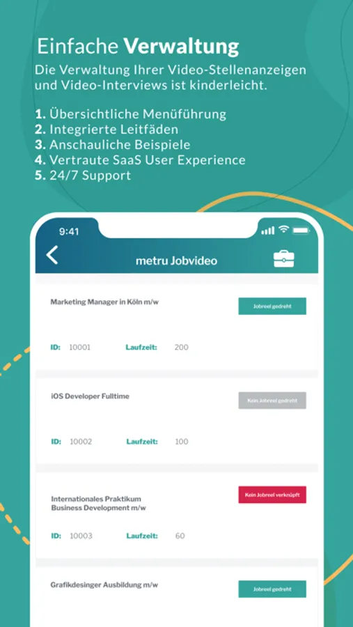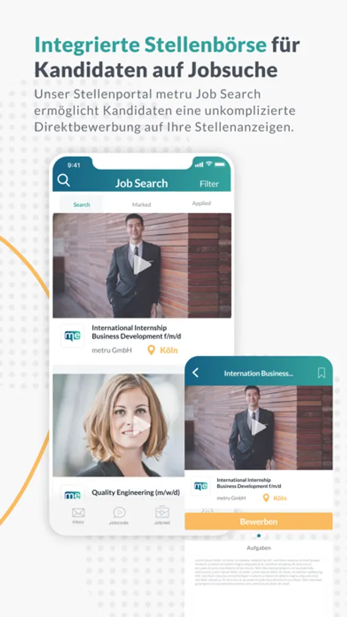 Dem Medium Video gehört die Zukunft. Mit Hilfe der metru Jobreel App können Sie unkompliziert Ihre videobasierte Stellenanzeige erstellen und verzichten auf die Notwendigkeit und hohen kosten, die eine professionelle Medienproduktion verursacht.