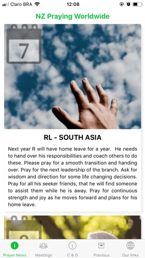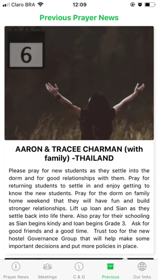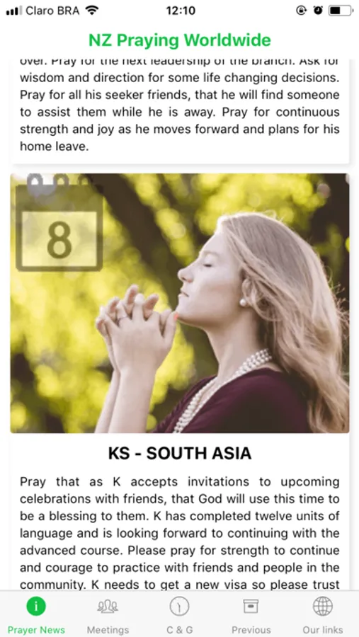 -Prayer news: Tells you who to pray for each day of the month. There is the option to scroll ahead to see who is coming up later in the month.