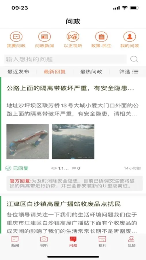 问政沟通上,搭建起群众与政府直接沟通的桥梁——重庆网络问政平台,网友年均问政帖文超2万条。生活中的难点、槽点随手问政,并得到解决,真正做到解民忧、帮民难、促民富。