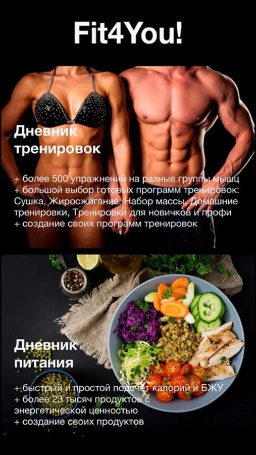 Виды и техники исполнения упражнений, графики прогресса, дневник питания, измерение объемов - все это Вы найдете в нашем приложении Fit4You!