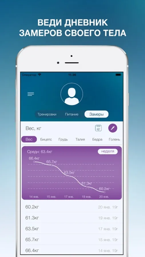 - замеры тела (Вес, Бицепс, Грудь, Талия, Бедра и Голень) с подробными графиками изменений