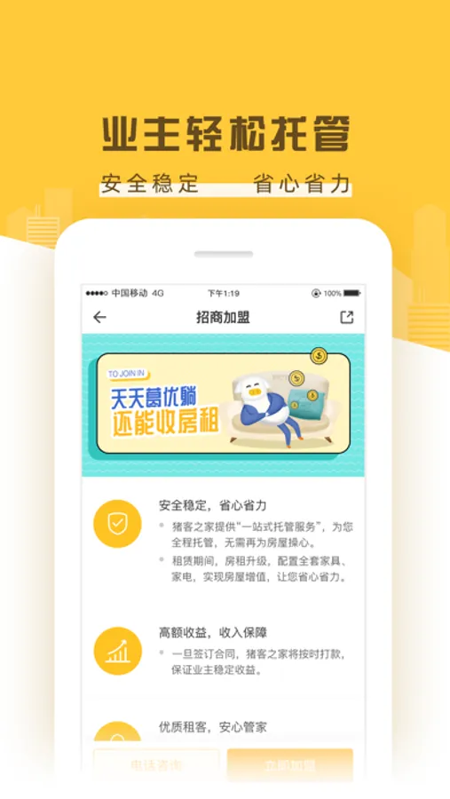 猪客之家,系由万齐事业倾力打造一站式智能租房平台,集物联网、云计算、互联网等大数据时代信息科技为一体创新颠覆传统租房模式,全面高效地接入业主和租户需求,真正实现“业主一站式轻松管理,租户一键式完美入住”的智能化管理形态。