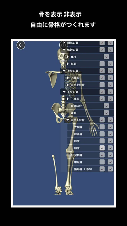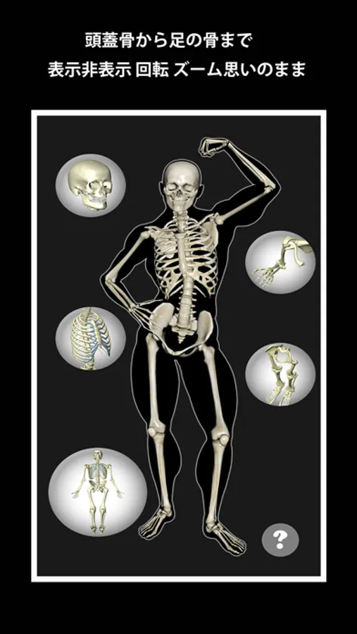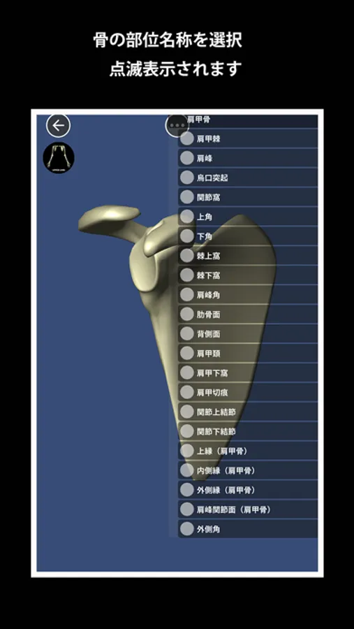 人体の骨と骨の部位名が立体的にわかる骨学アプリ。