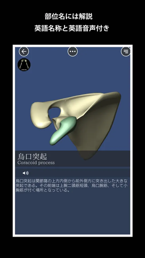 骨や部位名と解説の他、英語名とその発音音声データも収録しています。