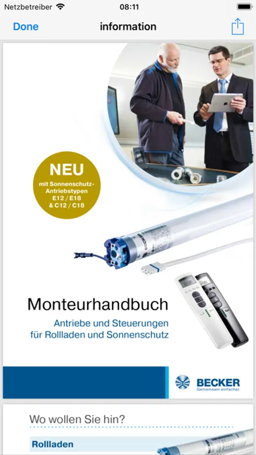 The Becker Antriebe service app - always giving you the right support when needed. We provide help when needed - even at the installation site! This app features not only the complete installation manual but also lets you set up your EVO BT drive via bluetooth and read out BDCi440 door controls using the optional NFC interface. After opening the installation manual once, you will also be able to browse it without existing internet connection - thus never letting you down when needed.