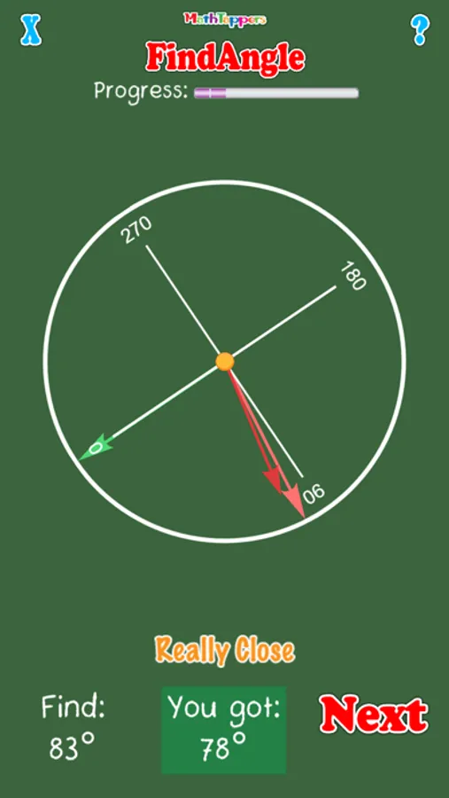 FindAngle is a simple game to help you improve your ability to estimate angles. When you are challenged to show an angle, place your finger on the red terminal arm and drag it to show the correct angle between the green initial arm and red terminal arm (remember positive angles are counterclockwise). When you let go of the red arm, you will be given some feedback on your estimate. Press the 'Next' button when you are ready to start the next challenge. Each game has 10 challenges.
