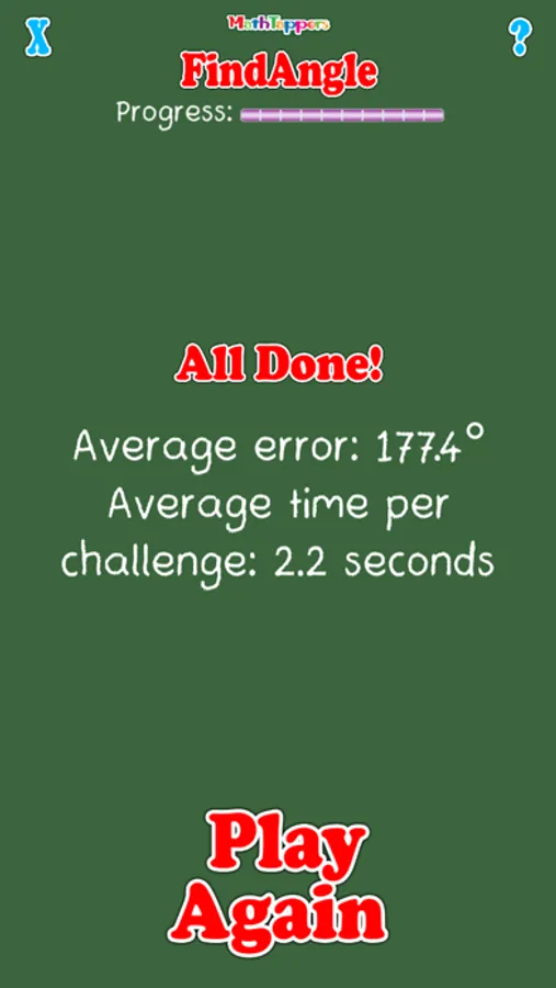 After you have completed 10 challenges, you will see a screen showing the size of your average error and the average time you took per challenge. We hope that our apps help folks build their understanding of the topics covered. As always we recommend that you focus on your accuracy before trying to improve your speed.