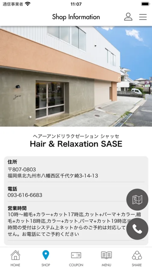 店舗のマップが表示され、地図アプリとも連携しているので、初めてのご来店の時も簡単に見つけることができます。