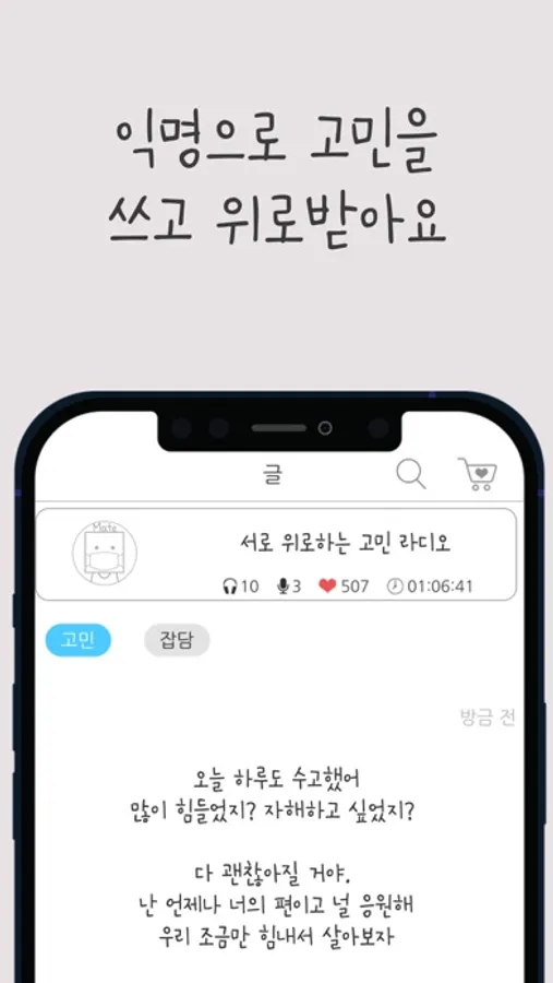 - 고민을 글로 쓰고 익명 친구들의 댓글로 위로받을 수 있어요.