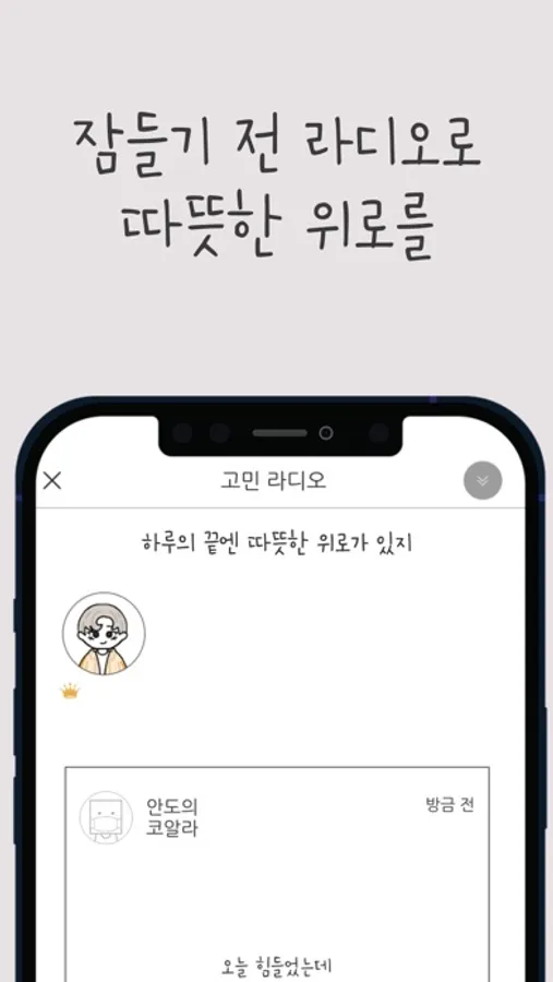 - 고민을 사연으로 보내고, 따뜻한 목소리로 위로받을 수 있어요.