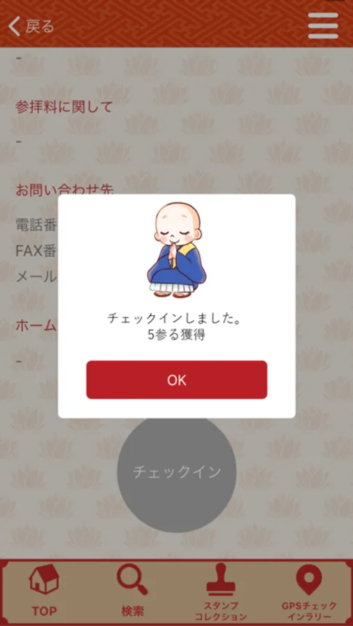 アプリを起動して日蓮宗寺院でチェックインすると「参るポイント」が貯まり、限定特典と交換ができます。