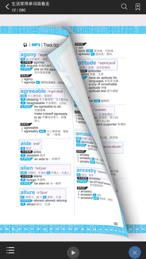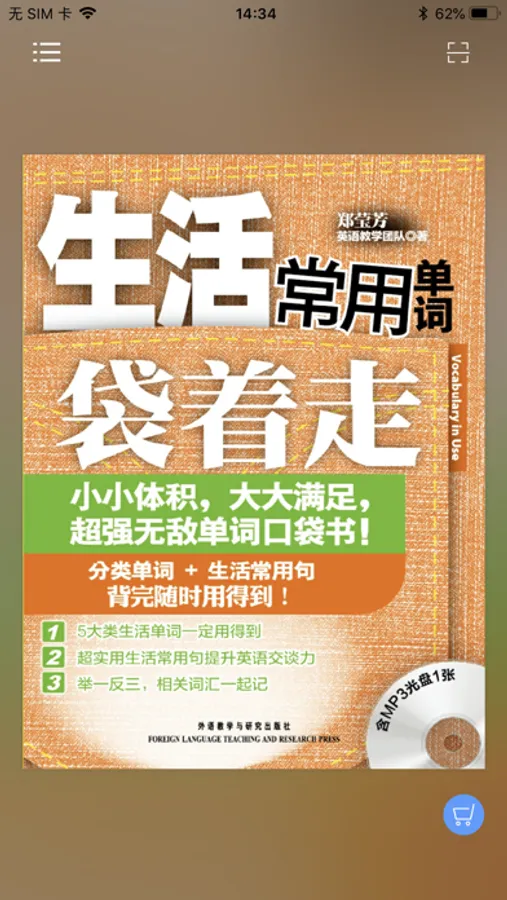 本APP包含日常生活中的高频词汇约2000个,按主题分为人格特质、日常活动、生活百科、事态发展和专业领域五大类。所含单词除列出音标、常用中文释义与词性外,还适时给出同义词、反义词、延伸短语及家族词汇,帮助学习者更好地掌握单词含义和用法,快速提升词汇量!每个单元设有40个“生活常用句”,全部由所学单词编写而成,让学习者做到即学即用,单词记忆更深刻!所配中英双语MP3光盘,收录了单词读音与释义,方便读者随时随地背单词。