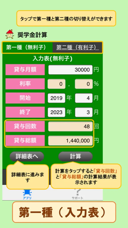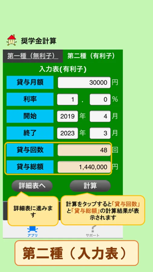 ・カンタンな入力で貸与・返還時の総額や回数、月々の返済額、利息等が計算できます。