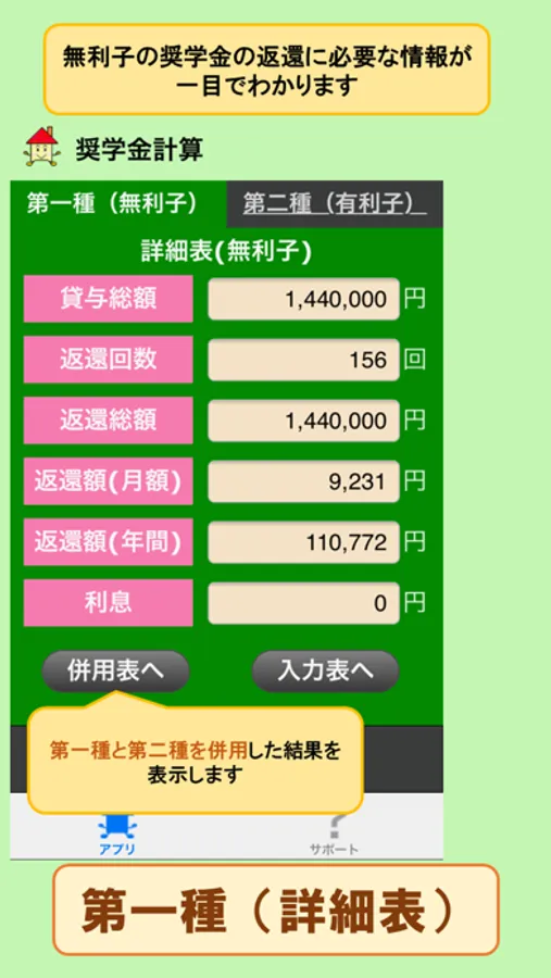 「詳細表へ」をタップすると、貸与総額・返還回数・返還総額・返還額(月額/年間)・利息を表示します。